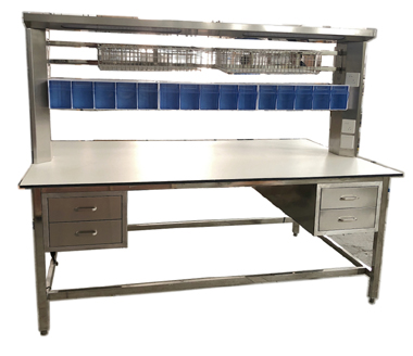 2.不锈钢或理化板台面,双层搁物架,双层照明设计满足打包亮度需求,带检查灯及五孔电源插座、网线接口、气源座等外接资源需求;